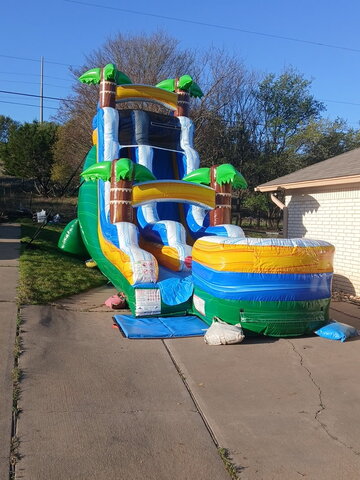 Dazzle kids and parents at your next big event with the 18' Tropical Green Marble Inflatable Water Slide. This 18' tall inflatable water slide stretches out to 35 feet in length for some big-time thrills and a whole lot of excitement. With its gender-neutral colors, this versatile inflatable can be employed for an all-boys or all-girls event, allowing for the potential to double your return on this investment! Try out this inflatable slide on a cool day without water for some fun and entertainment or simply connect a standard garden hose to the built-in misting system and dive into some refreshing relief from the summer heat! All of our inflatable wet / dry slides were designed with children's safety at heart, featuring an inflated landing zone with built-in drains that keeps the water level low enough for a good time, but safe enough for kids of all ages.