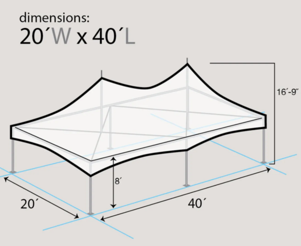 THIS CANOPY IS REQUIRED TO BE STAKED IN PLACE. IF WE CAN NOT USE STAKES RENTAL OF BARRELS REQUIRED. This unit consists of 2 20x20 and 1 rain gutter in center.