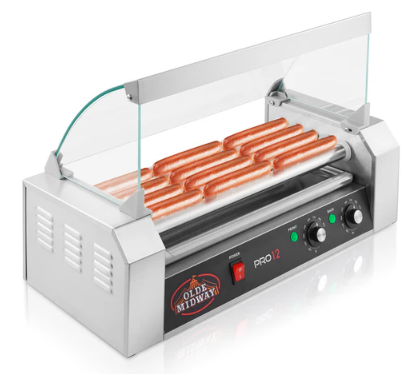 This hot dog roller machine from Olde Midway makes it easy to quickly and easily cook up to 18 hot dogs at a time. This commercial grade 900 watt machine features 7 stainless steel non-stick rollers that rotate 360 degrees to cook all items evenly. Cook hot dogs, sausages, or taquitos quickly and evenly on the slow rollers without the time or mess of using a grill. Whether you are cooking franks, thick stadium dogs, sausages, or even frozen hot dogs, these rollers can do it all. The dual temperature controls mean that you can set the temperature to cook on the back rollers while the front rollers will keep the cooked items hot and ready to eat. The stainless steel construction makes it ideal for parties, movie theaters, concession stands, or convenience stores. Our hot dog maker is loaded with safety features like an extra thick tempered glass shield, non-skid rubber feet, and a built-in fuse. Dimensions: 23" Width x 13" Depth x 16" Height and weighs 28 pounds. Operates on a US-standard 120 volt power cord.